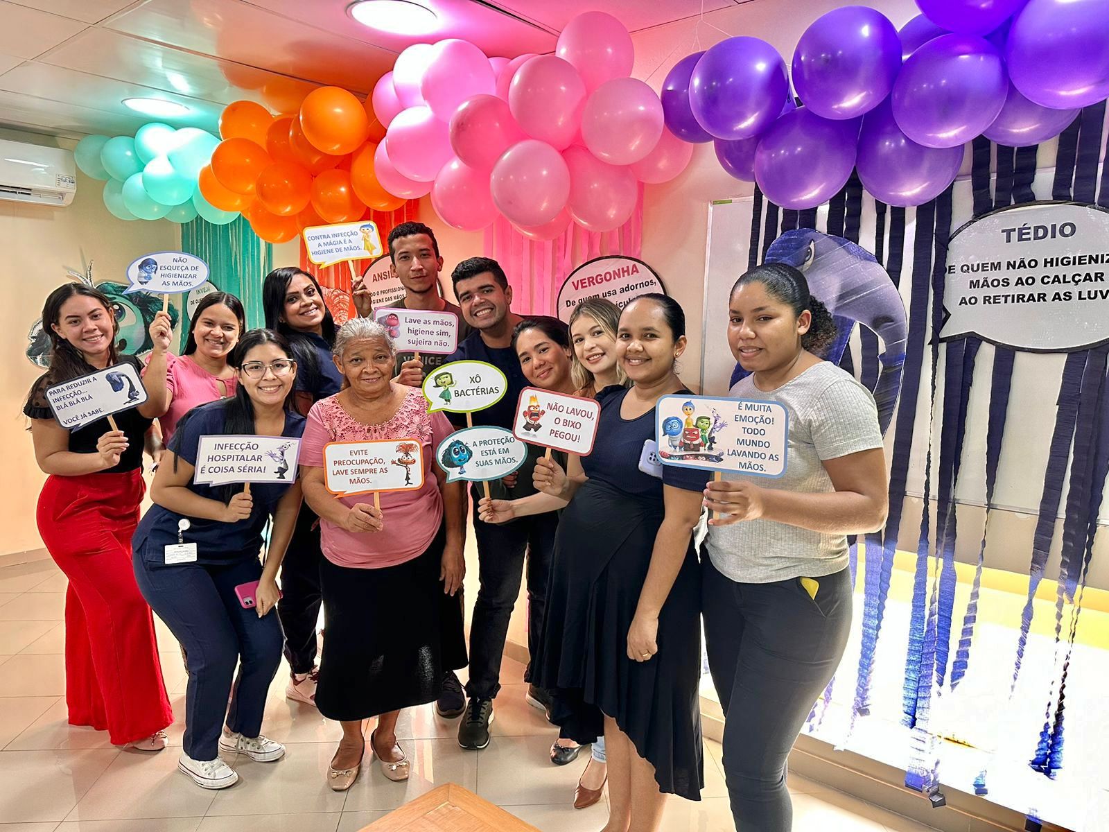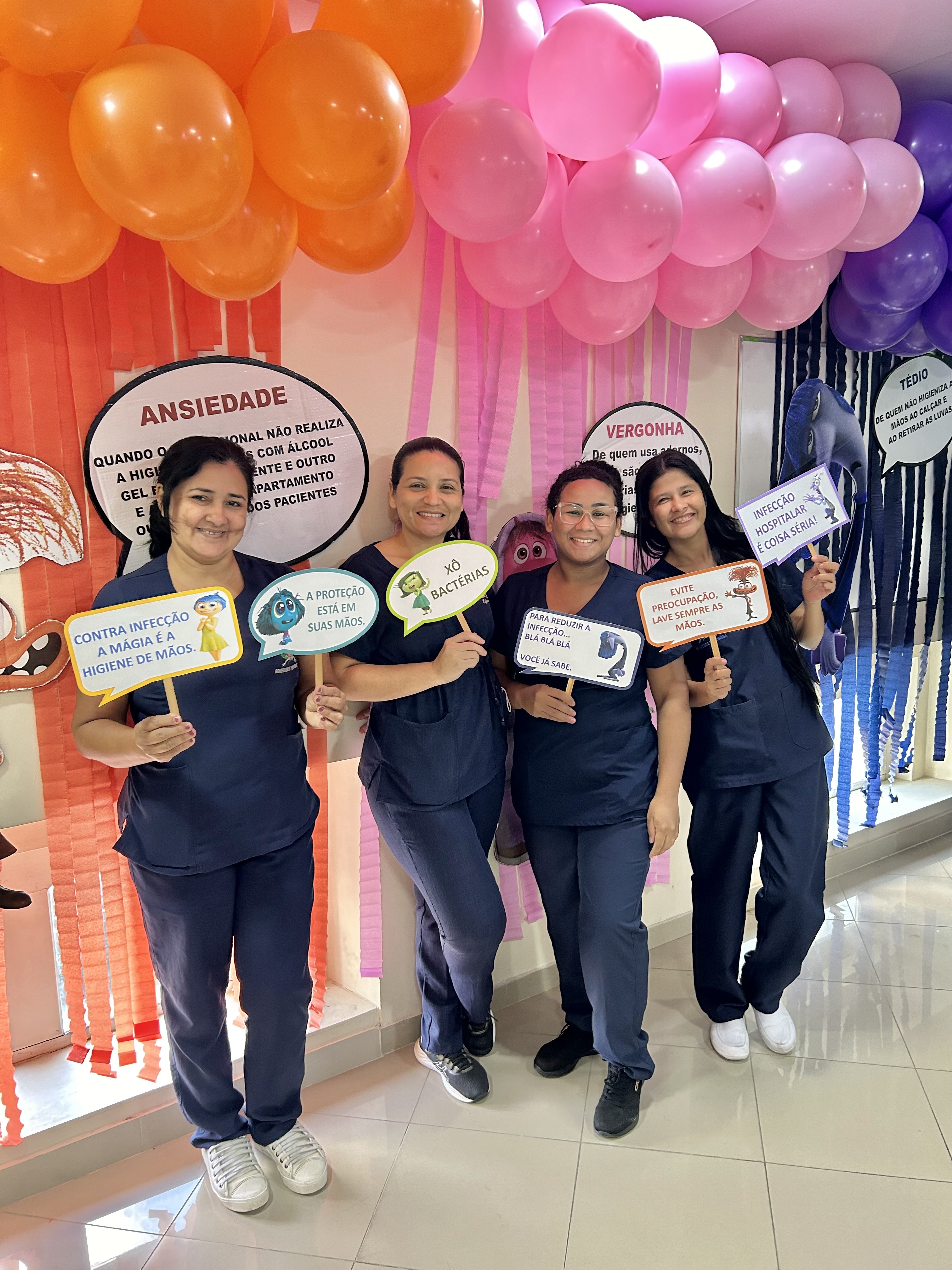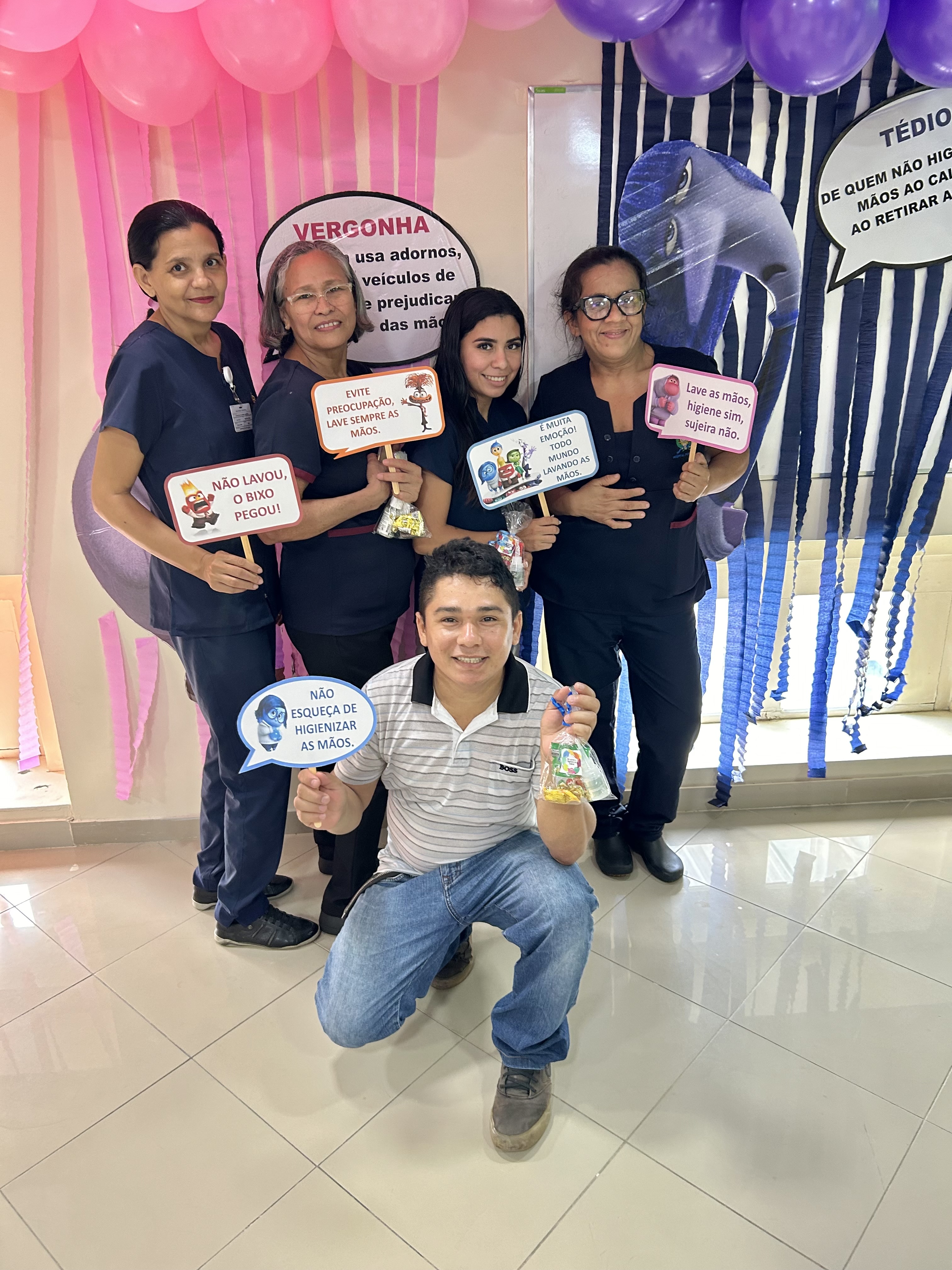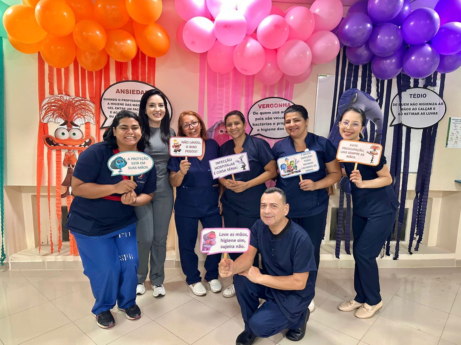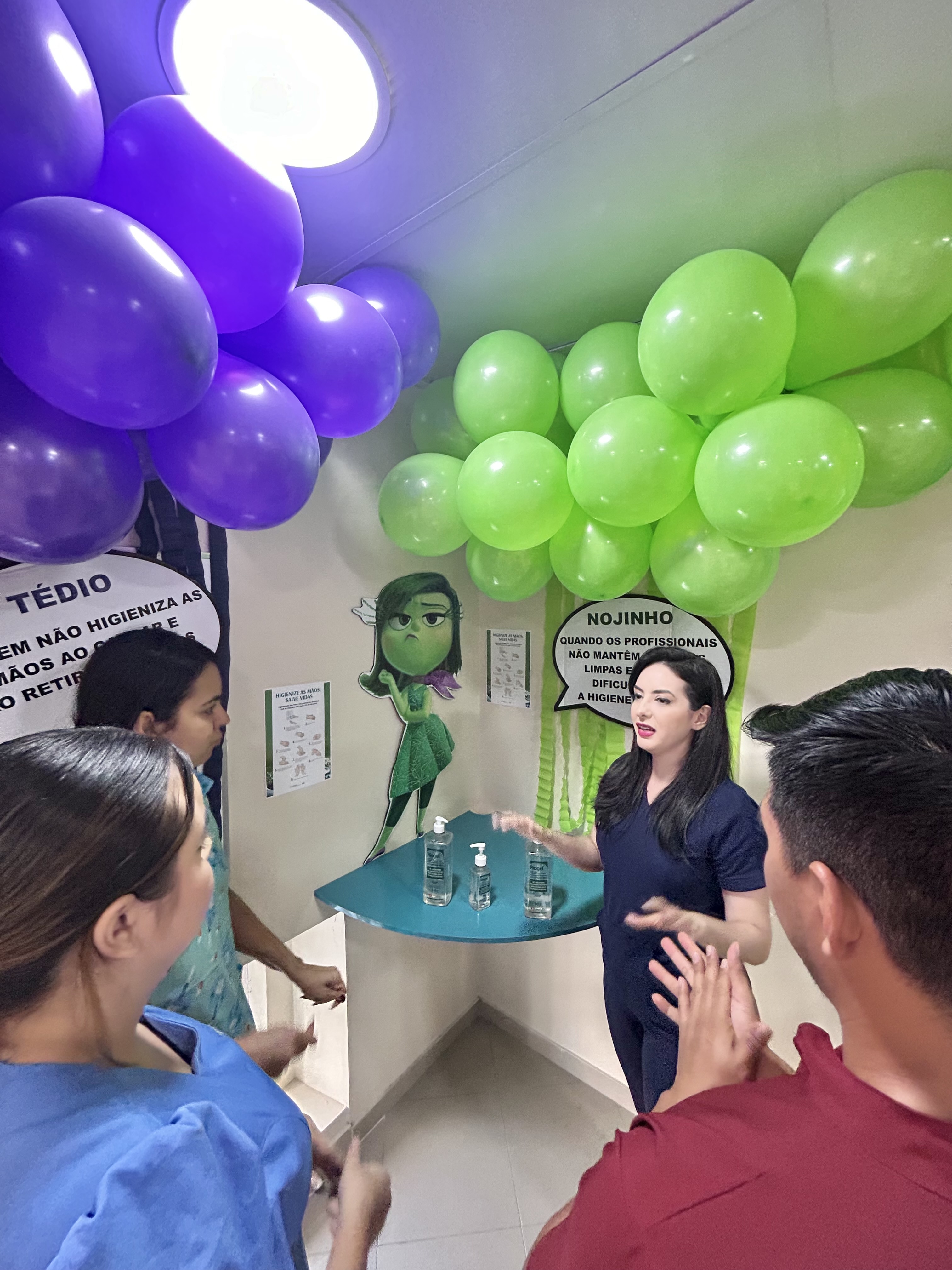 A decoração temática, inspirada no filme “Divertida Mente”, trouxe um toque criativo à campanha. As emoções representadas no filme foram adaptadas para alertar sobre os cuidados com a higiene das mãos. A “inveja”, por exemplo, refletia o desejo de imitar quem já realiza a higienização nos cinco momentos recomendados; o “medo” fazia referência ao temor das infecções; e a “alegria” simbolizava a satisfação em higienizar as mãos corretamente.