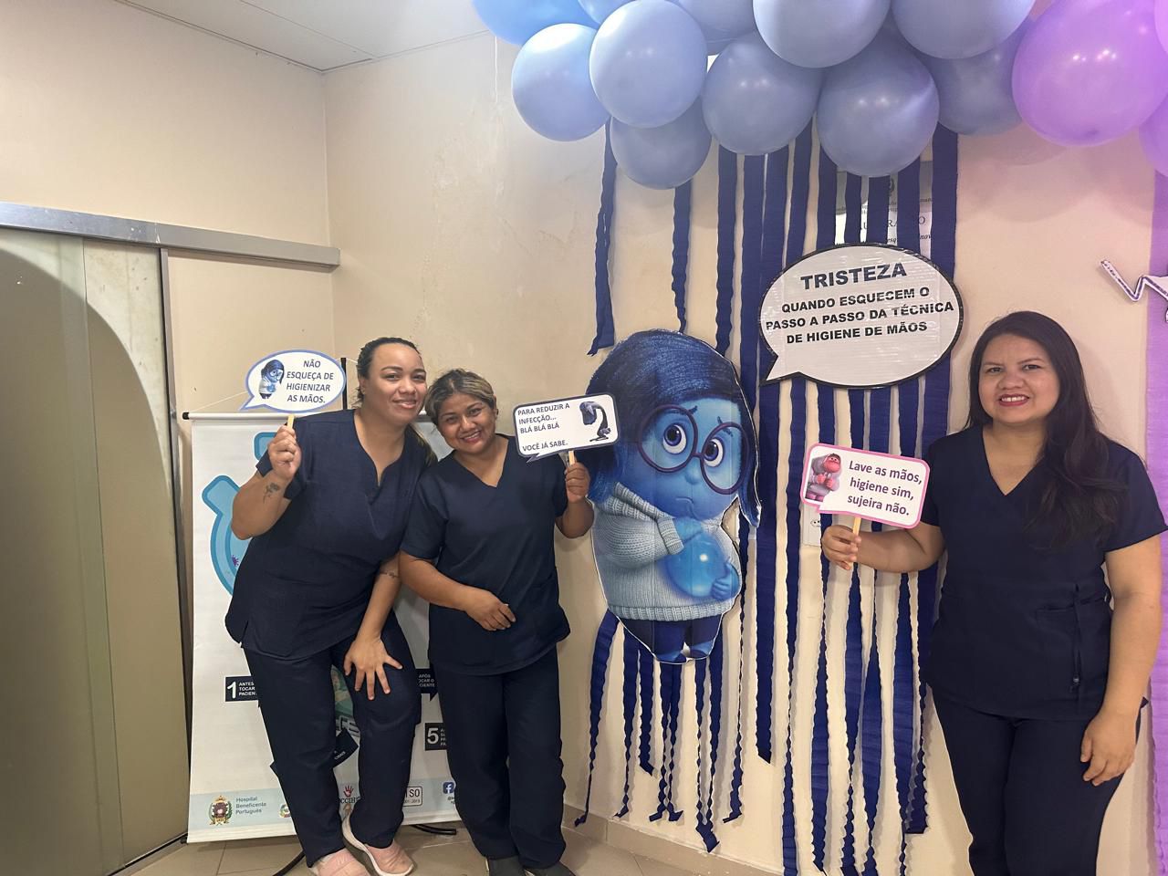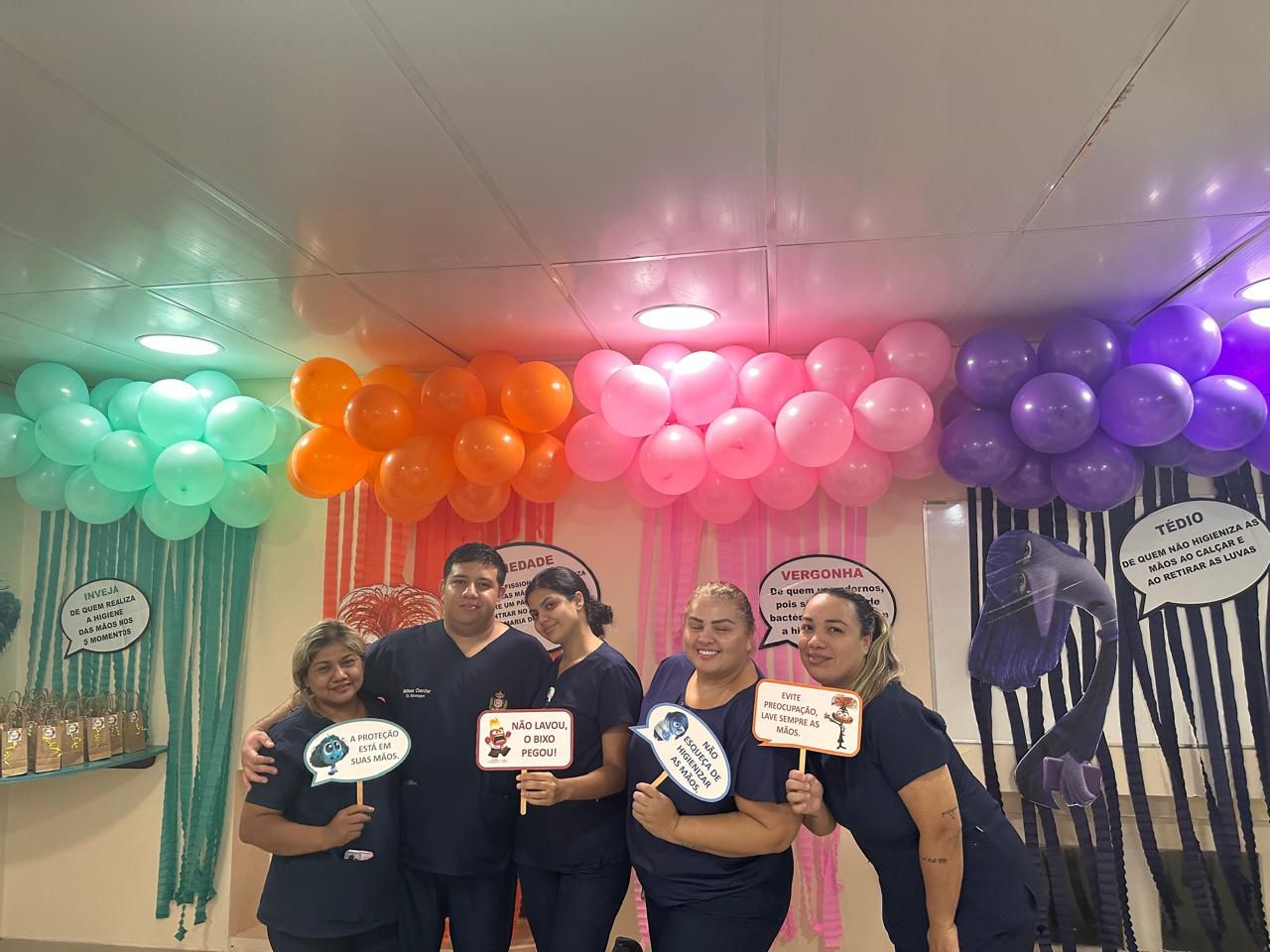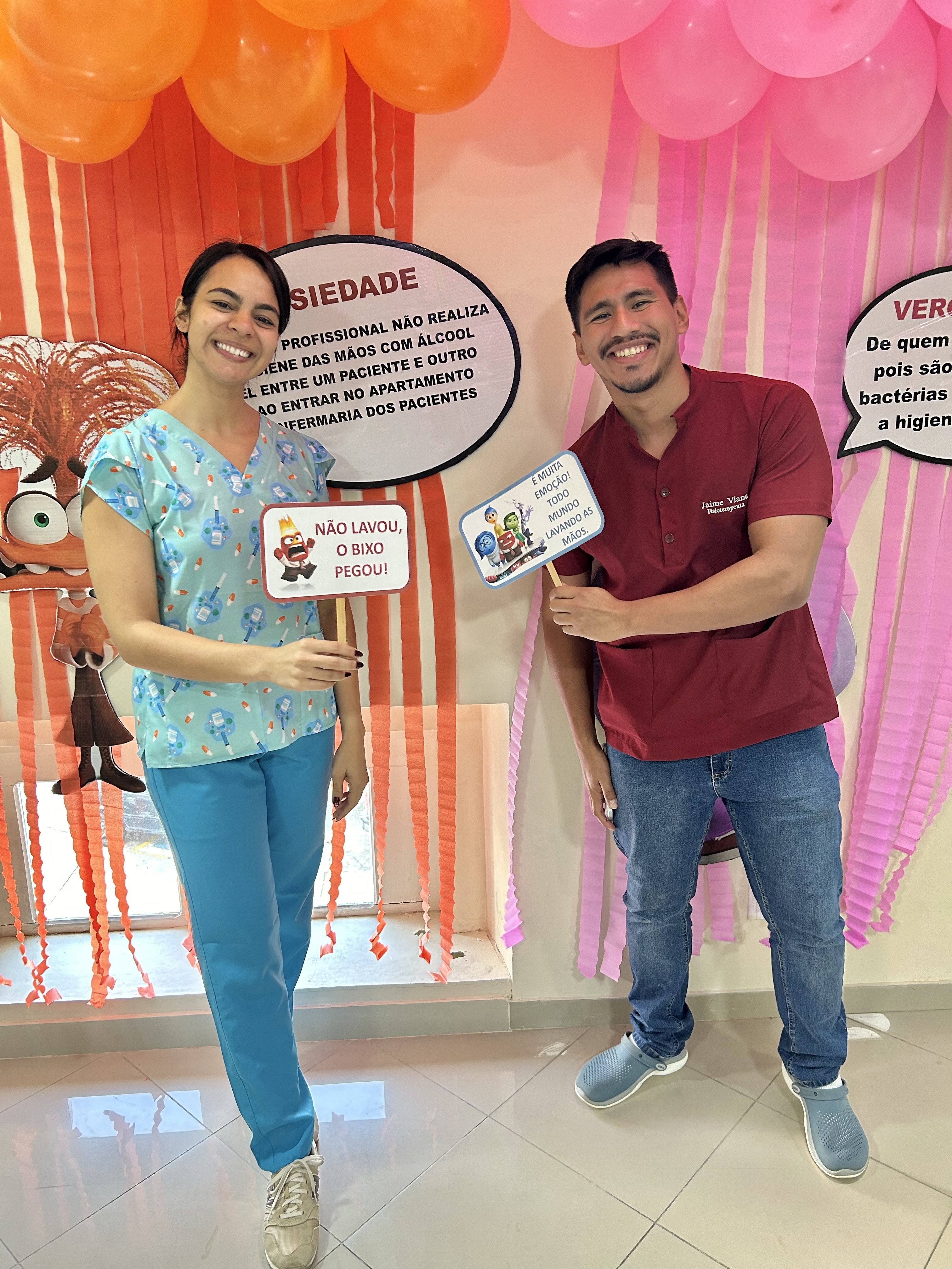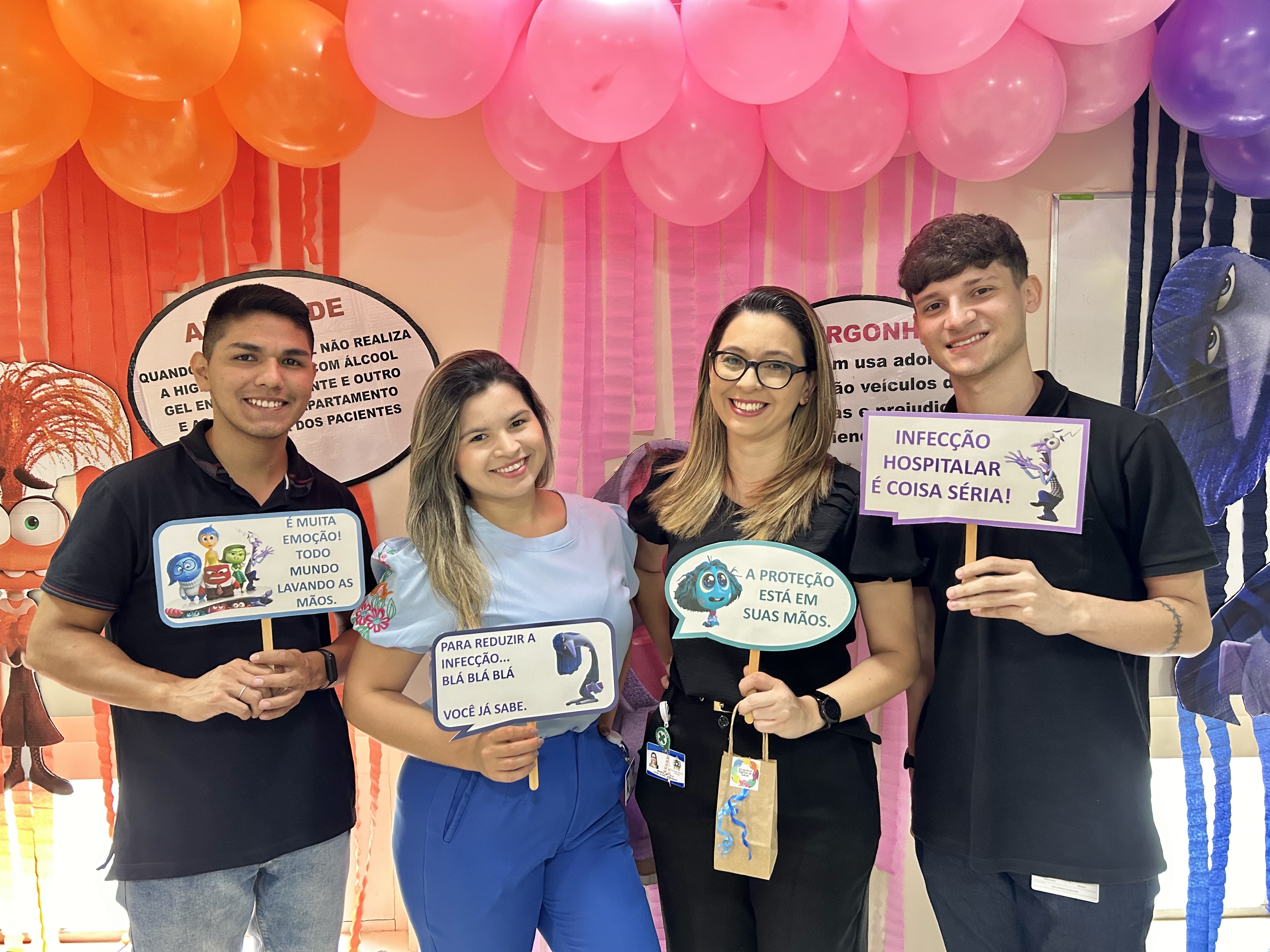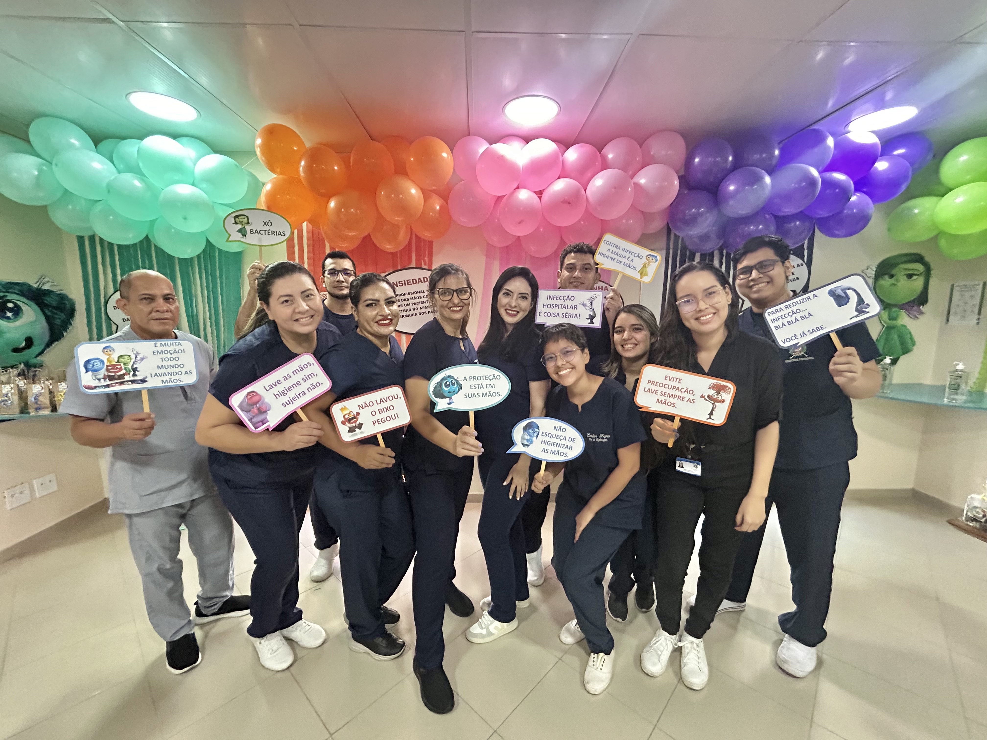 A decoração temática, inspirada no filme “Divertida Mente”, trouxe um toque criativo à campanha. As emoções representadas no filme foram adaptadas para alertar sobre os cuidados com a higiene das mãos. A “inveja”, por exemplo, refletia o desejo de imitar quem já realiza a higienização nos cinco momentos recomendados; o “medo” fazia referência ao temor das infecções; e a “alegria” simbolizava a satisfação em higienizar as mãos corretamente.