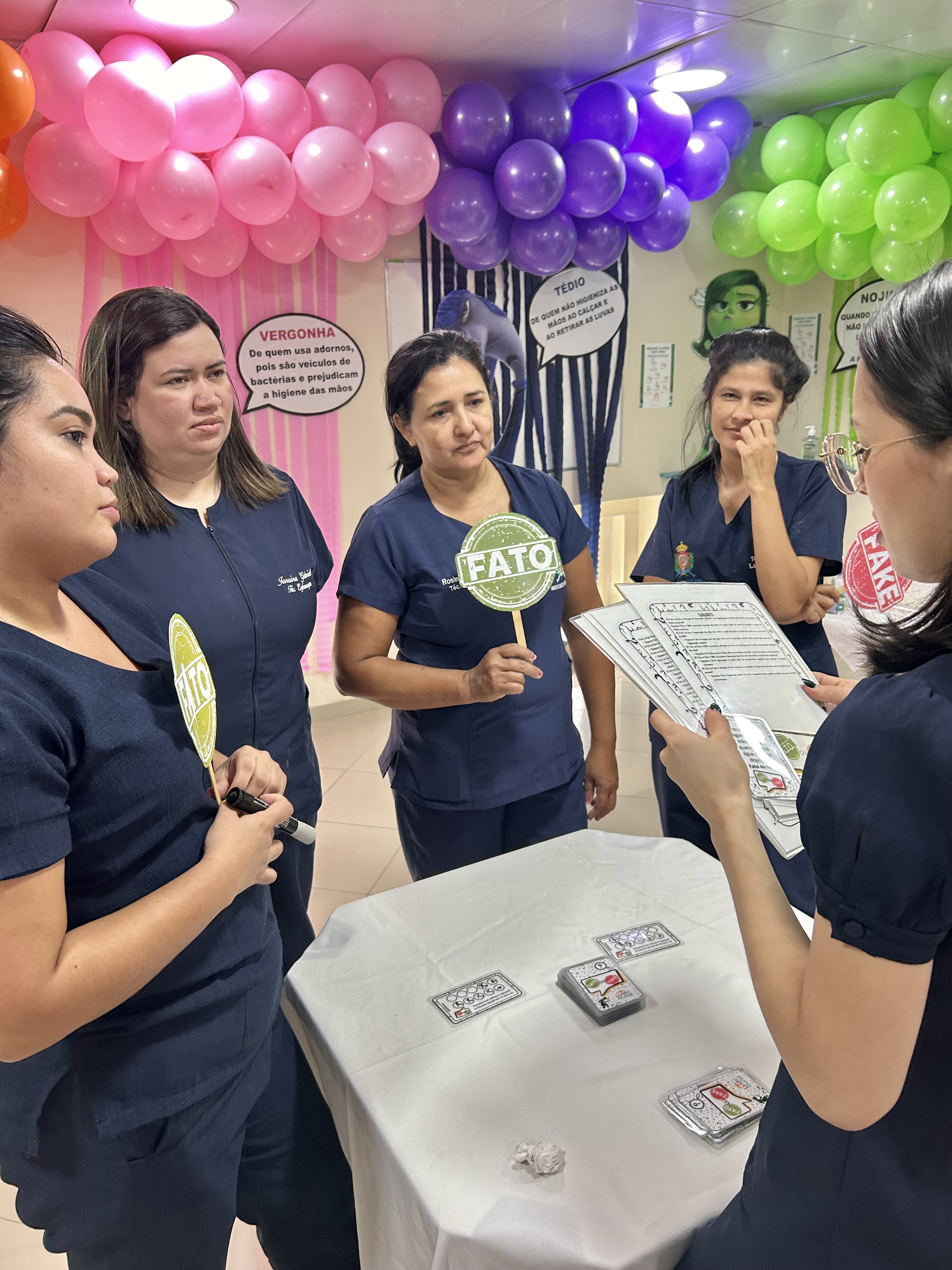Dividida em três dias, a campanha teve dois dias dedicados à equipe assistencial e um dia para as equipes administrativas. Colaboradores de todos os turnos participaram de atividades interativas, como dinâmicas sobre como higienizar corretamente as mãos, jogos de quebra-cabeça e a brincadeira “Fato ou Fake”, que testava o conhecimento dos participantes sobre o tema. Aqueles que se destacavam nas atividades tinham a chance de estourar um balão e ganhar brindes exclusivos.